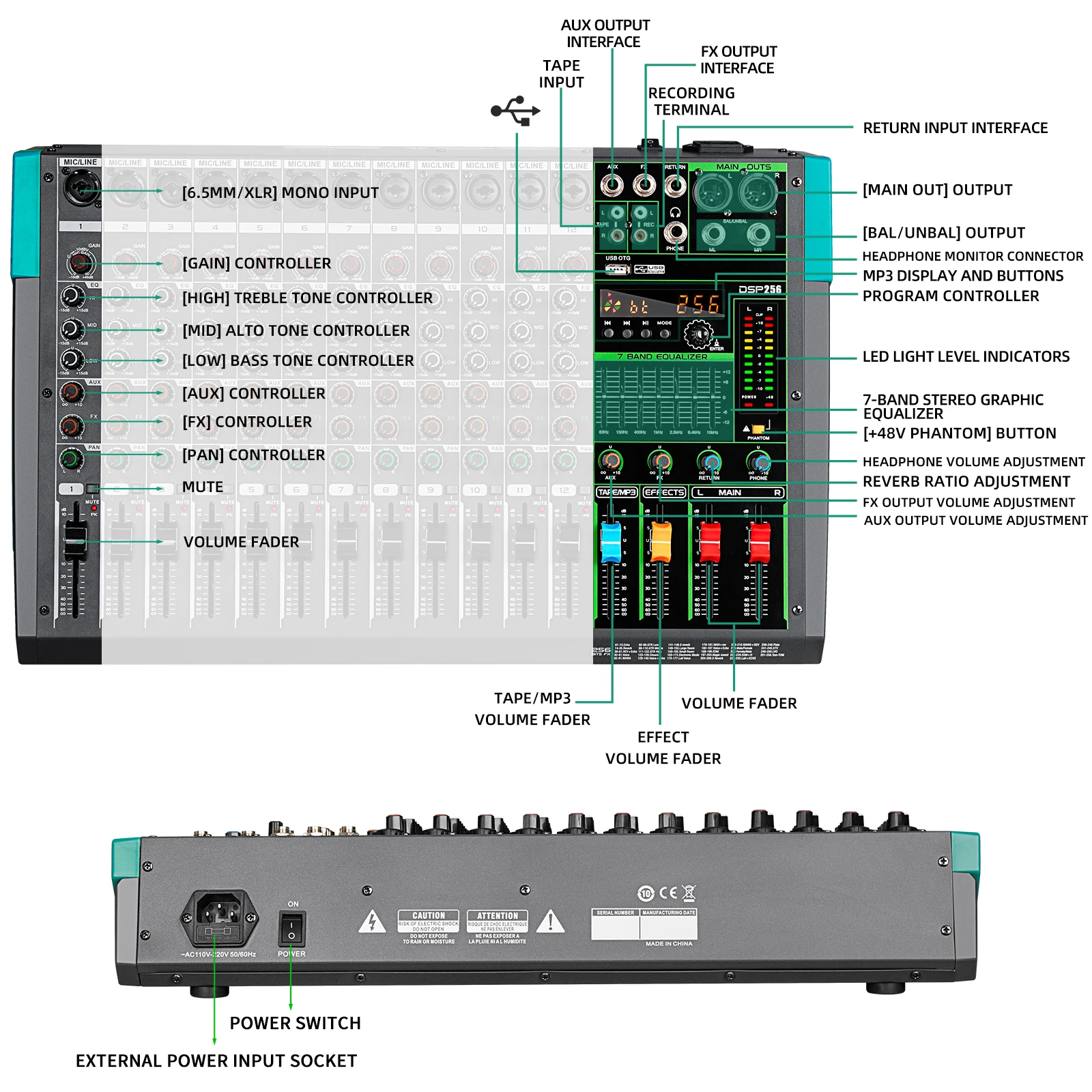 2.The USB interface of the mixer can be connected to the computer interface using a USB to USB cable. It is a two-way interface that can input the sound input from the microphone to the mixer to the computer. It can also transmit the audio from the computer back to our mixer. Use the tape mp3 fader and the volume fader to control the volume.