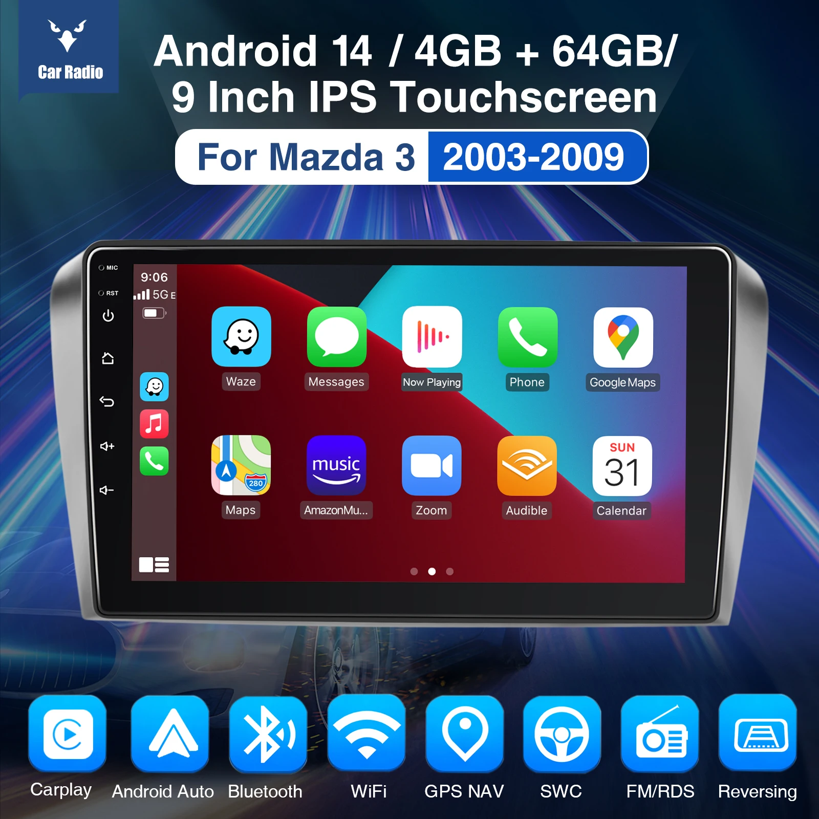 9" Android 14 Car Stereo Radio 4+64G For Mazda 3 2003-2009 GPS Navigation Apple CarPlay WiFi Bluetooth FM/RDS SWC+DAB&DVR&Camera