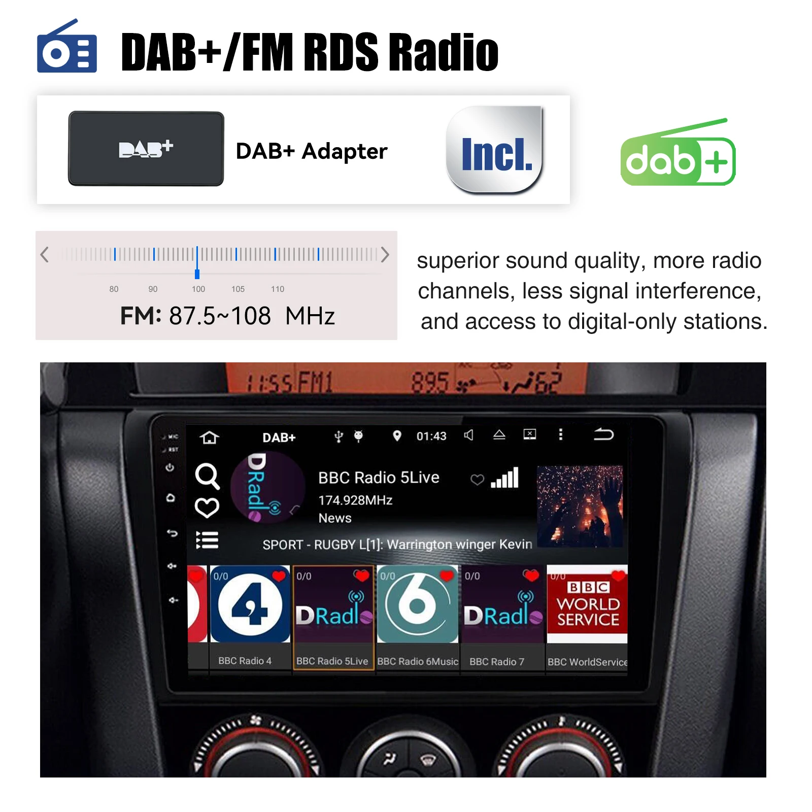 (Optional) DAB+ Adapter: Digital audio broadcast allows you to receive national music with your local known and new channels. CD sound quality and noise-free transmission make DAB radio a special experience in the vehicle.