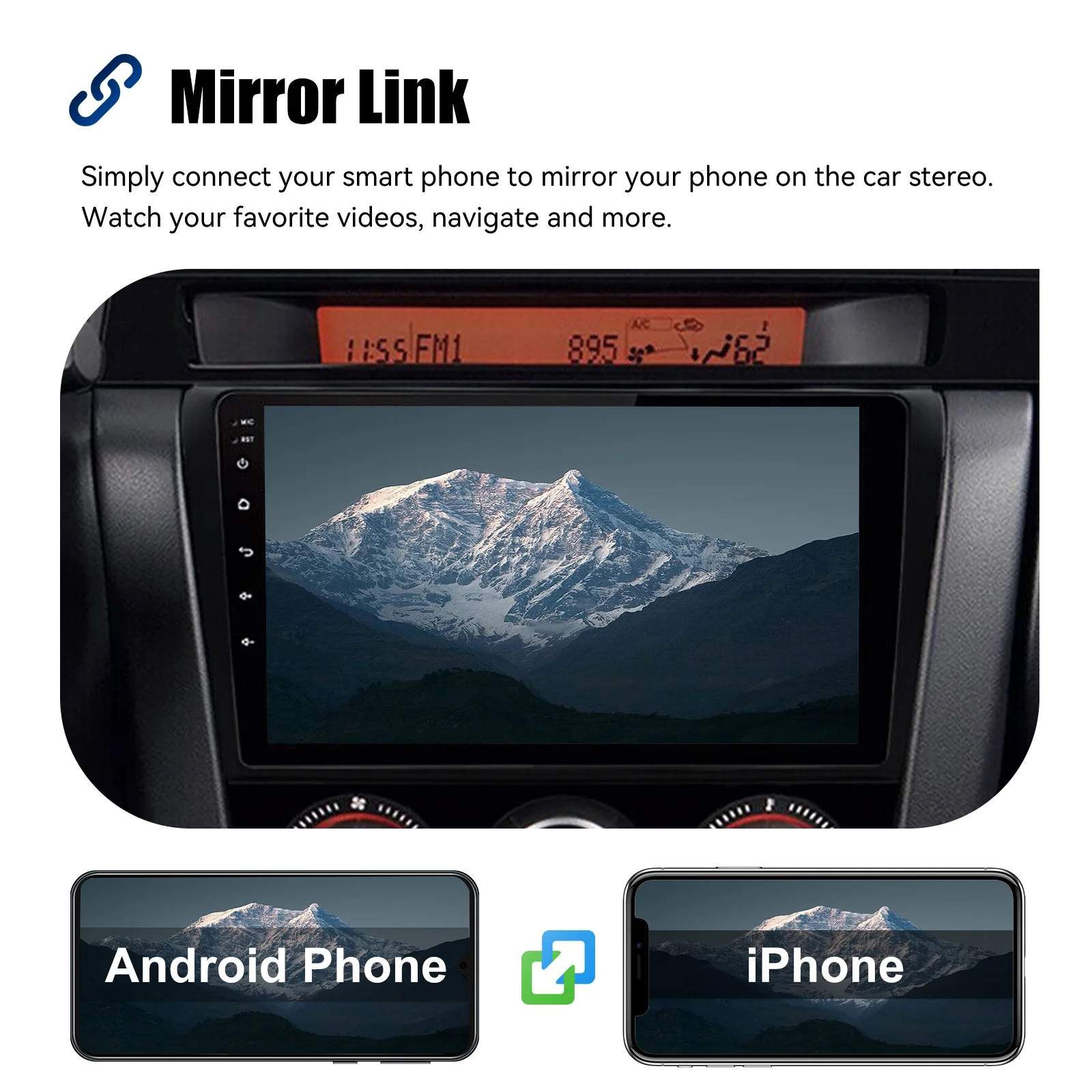 MIRROR LINK & APPLE CARPLAY & ANDROID AUTO: With this car radio, You can mirror your smartphone screen to the car radio using apps like Google Maps, Spotify, Youtube, etc. Replace your cell phone with the car screen and turn your vehicle into a smart platform. Immerse yourself in a seamless and user-friendly infotainment experience with Apple CarPlay & Android Auto. Connect your iPhone to Apple CarPlay or your Android smartphone to Android Auto and securely access calls, texts, navigation, music and more. With intuitive operation via the touchscreen or voice control, you have all functions at your fingertips while you remain safely at the wheel. Use your favorite apps and stay connected at all times while keeping your eyes on the road.