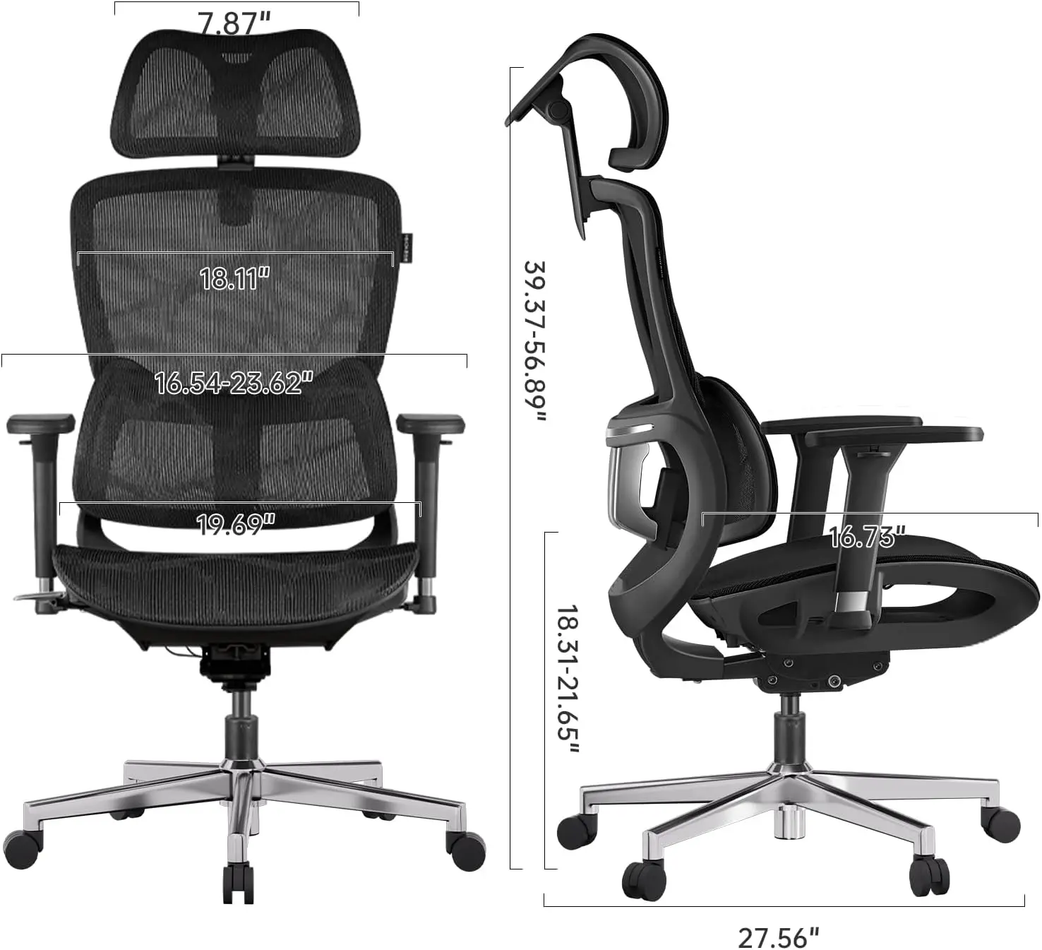 Experience ultimate comfort and support with our premium ergonomic office chair designed for long hours of work. This high-back mesh chair features innovative 6-way adjustable lumbar support that can be customized in three dimensions - forward/backward, vertical height, and left/right suspension. The floating structure design perfectly contours to your lower back curve, eliminating pressure points and providing comprehensive spinal alignment. Our 3D adjustable armrests offer multi-directional customization with height adjustment up to 7.5cm, forward/backward movement up to 5cm, and 40-degree rotation capability. Made from skin-friendly soft materials, they provide optimal elbow support for various working positions while reducing shoulder strain. The advanced headrest system provides complete neck support with vertical adjustment up to 10cm, forward/backward movement up to 3cm, and 60-degree rotation to accommodate different body types and sitting preferences. Enjoy flexible reclining functionality with three lockable positions up to 135 degrees - perfect for quick breaks or comfortable power naps during your workday. Constructed with premium breathable mesh fabric throughout the seat and backrest, this chair ensures maximum airflow circulation to keep you cool during extended sitting sessions. The durable mesh material combines comfort with longevity while maintaining its supportive properties over time. Additional premium features include a gravity-sensing chassis that automatically adjusts recline resistance based on user weight for smooth transitions between positions. The convenient wire-controlled adjustment system allows one-button operation without bending down or complicated mechanisms. Perfect for home offices, corporate environments, gaming setups, or study areas - this ergonomic chair transforms your workspace into a productivity zone where comfort meets functionality. The sleek black design complements any interior decor while providing professional-grade ergonomic benefits typically found in much more expensive chairs. Assembly is straightforward with clear instructions included. Invest in your health and productivity today - upgrade your seating experience with our feature-rich ergonomic office solution designed for all-day comfort.