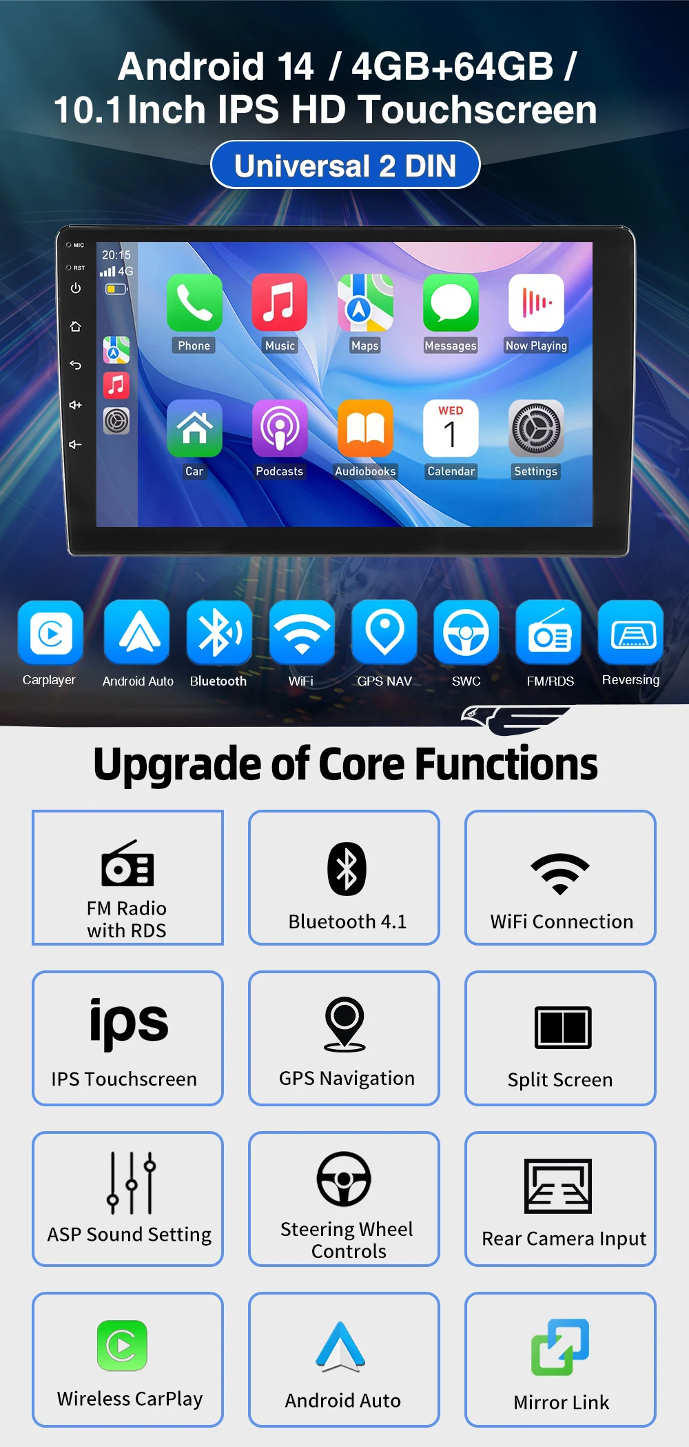 Special Features: Built-in GPS,Mobile Phone,MP3 players,CarPlay,android auto,Reversing Input,Split Screen,Support steering wheel control