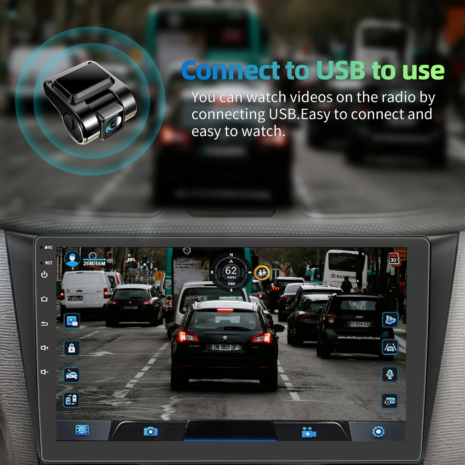 10 Inch 2 DIN Android 14 Car Radio: The Android car radio with 10 inch IPS capacitive touch screen, 2GB RAM and 32GB ROM / 4GB RAM and 64GB ROM provides enough space to download your favourite apps and videos, so driving won't be boring anymore. With two USB ports, it supports fast mobile phone charging. With the rear microphone input, you can add a microphone to make your voice clearer (not included).