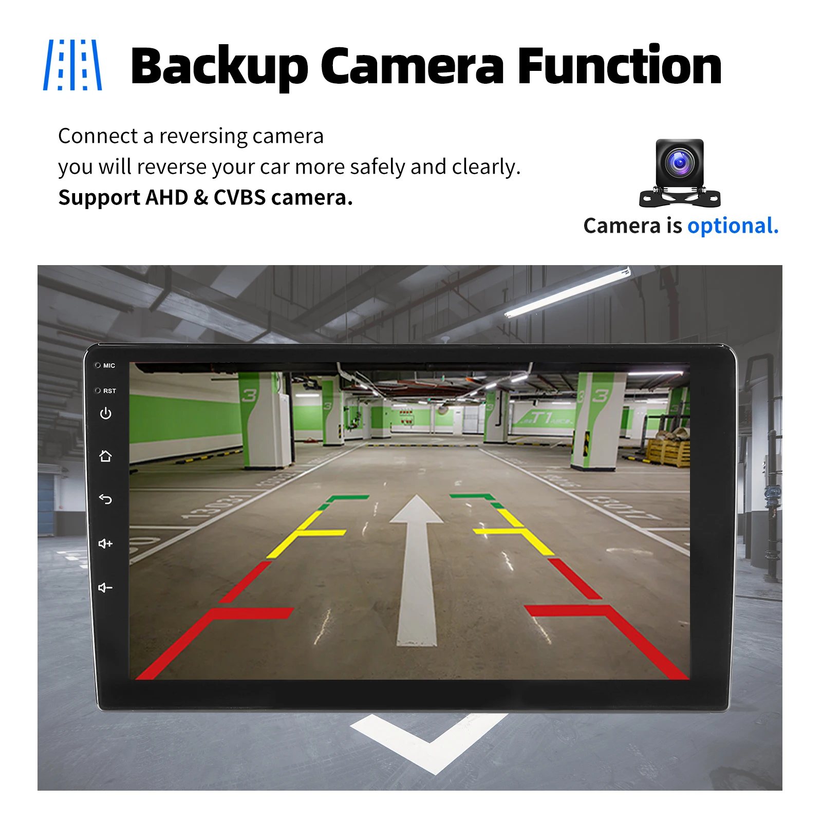(Optional) AHD Rear view camera input & SWC: Supports the rear view function. After the camera is installed correctly, the radio automatically turns on the camera and displays an image on the screen when you put the car in reverse. Supports steering wheel control function and more. You can switch to the functions you want quickly and more conveniently.