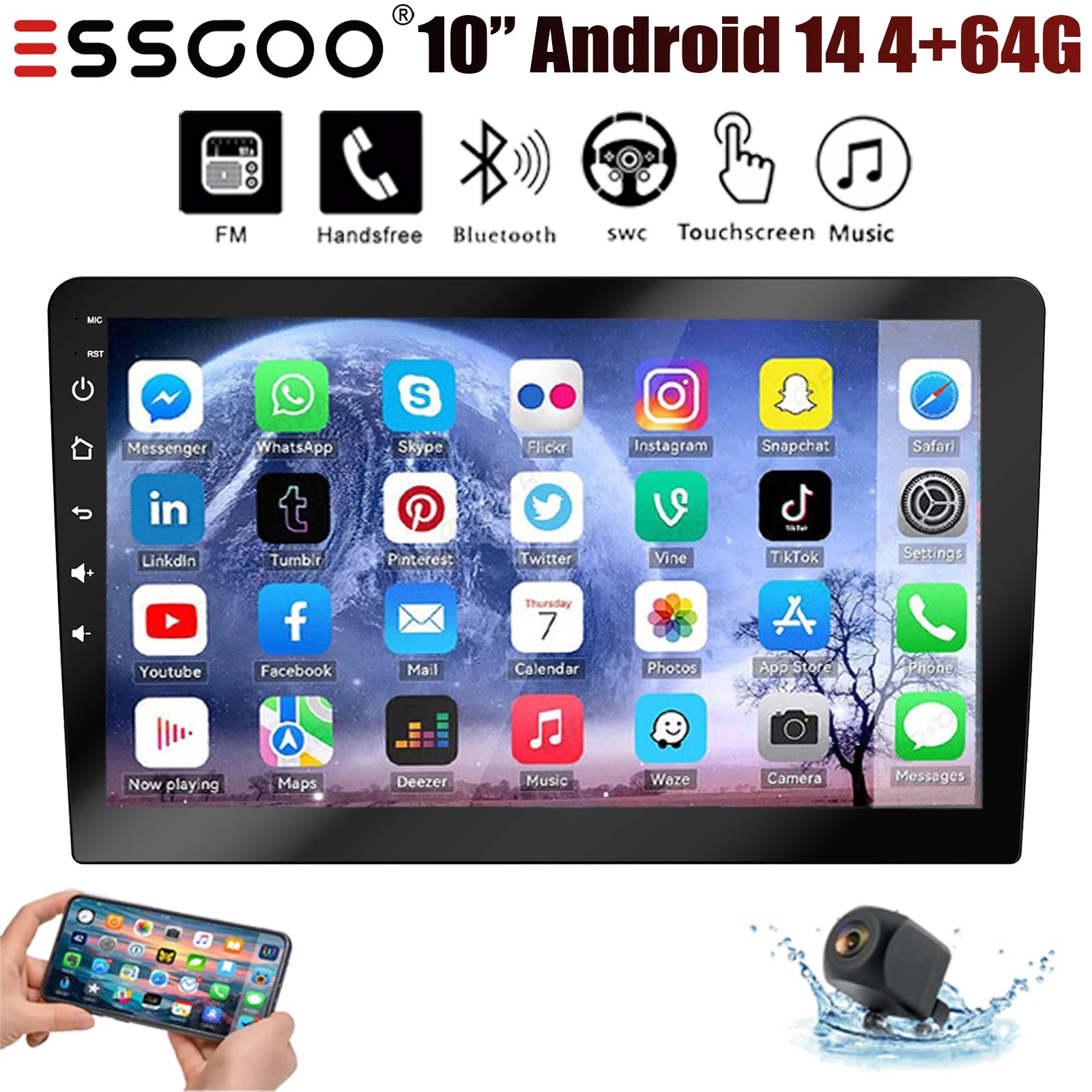 ESSGOO 10.1" Android 14 Carplay Car GPS Radio Stereo Double 2Din Head Unit FM SWC Bluetooth 4+64GB IPS Split Touch Screen WiFi