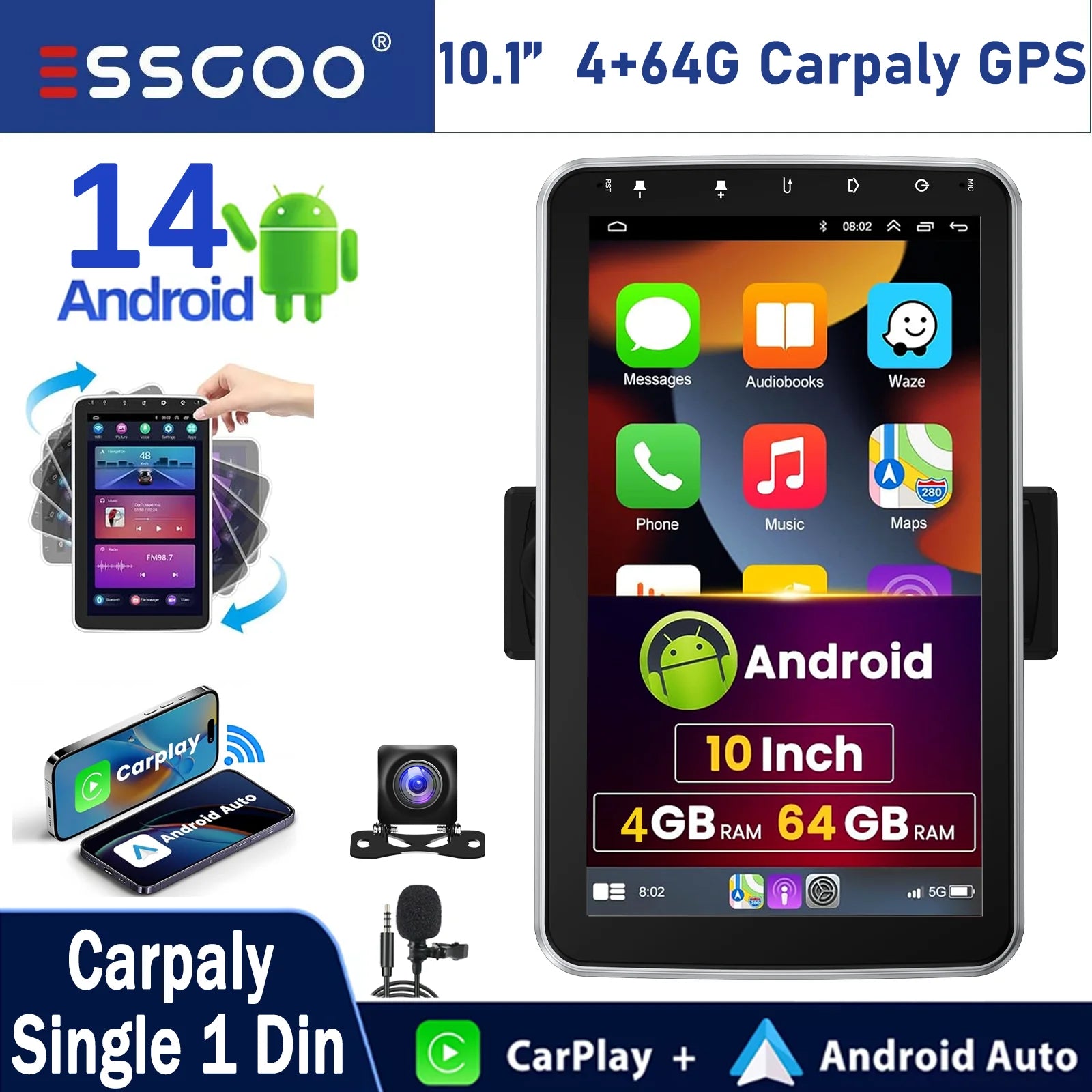 ESSGOO 10.1 Inch 4+64GB Rotatable IPS Touchscreen Single 1 DIN Car Stereo Wireless Apple Carplay Android Auto FM Bluetooth GPS