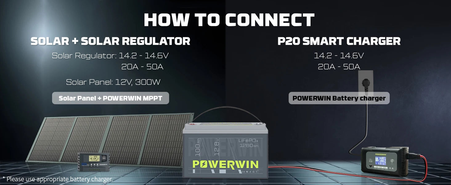 POWERWIN BT100 12.8V 100Ah 1280Wh LiFePO4 Battery 4000+Deep Cycle Rechargeable Built-in BMS Grade A Cell Solar Power Inverter RV