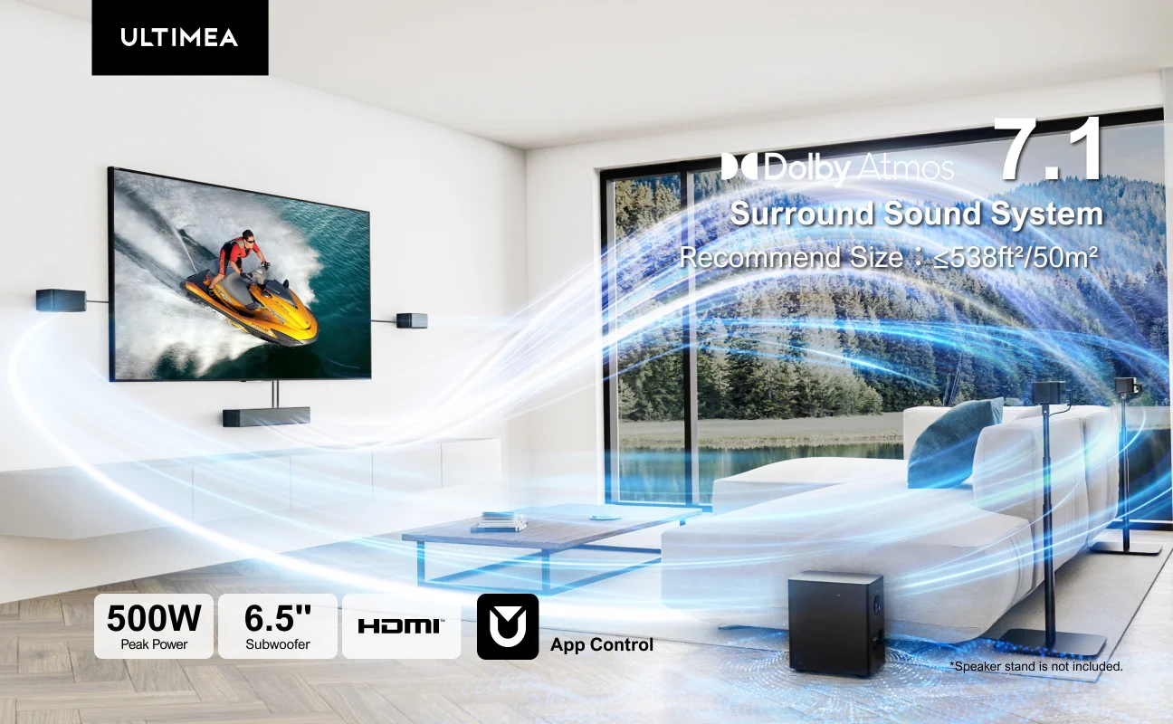 ULTIMEA 7.1Ch Soundbar with Dolby Atmos, APP Control, Surround Sound System for TV, 4 Wired Surround Speakers, Sound Bar for TV
