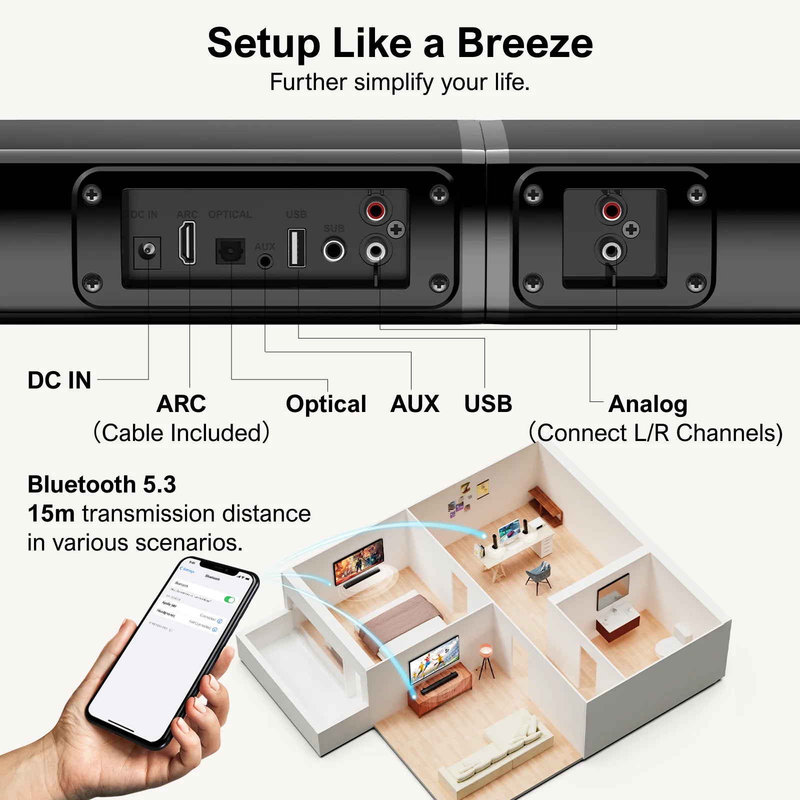 Seamless Connectivity - The soundbar has wired and wireless dual connection options, including ARC, Optical, AUX, and USB ports (all cables included). Bluetooth 5.3 technology ensures faster speeds and a coverage range of up to 49 feet.